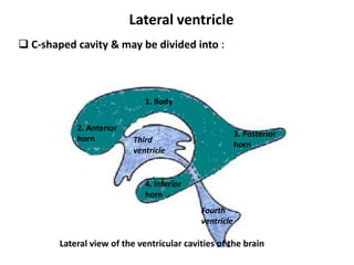 Cerebrospinal Fluid Dynamics Relevant to Hydrocephalus There are four ventricles in all: two lateral ventricles, the third ventricle, and the fourth ventricle. The ventricles are connected by narrow passageways. Cerebrospinal Fluid (CSF) flows through the four ventricles and then flows between the meninges in an area called the subarachnoid space.