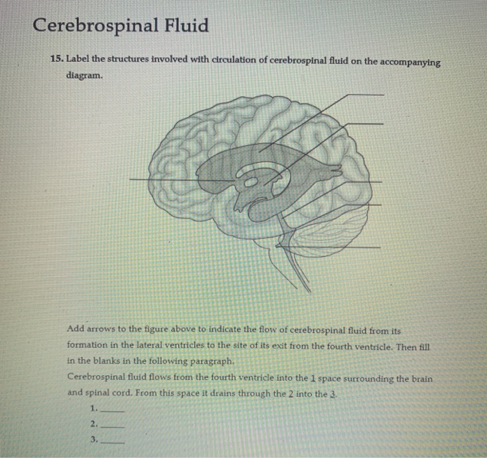 Solved > 14.Label the structures involved with circulation of ... 14.Label the structures involved with circulation of cerebrospinal fluid on the accompanying diagram. Add arrows to the figure above to indicate the flow of cerebrospinal fluid from its formation in the lateral ventricles to the site of its exit from the fourth ventricle. Then fill in the blanks in the following paragraph. Solution 5 (1 Ratings )