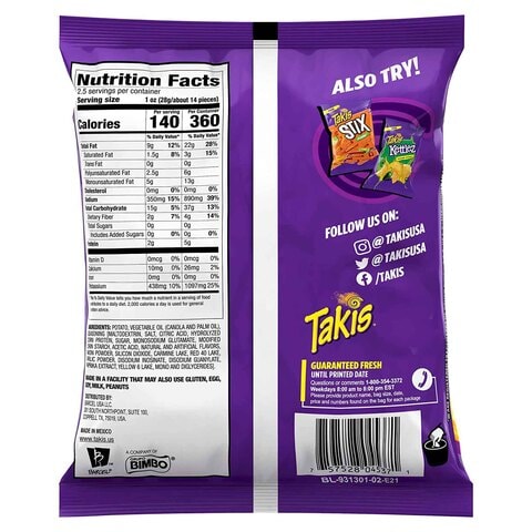 › takis-nutrition-factsTakis Nutrition Facts, Ingredients, Are Takis Bad For You? Sep 21, 2021 · Also, one serving of Takis is only 13 pieces but has 420 mg of salt. Adults shouldn’t eat more than 1500 mg per day. So, those few Takis already use up almost 1/3 of your daily allowance. High salt levels raise your blood pressure. 03. What tastes good with Takis? Ans: Here are some ways that you can incorporate Takis into recipes for a fresh ...