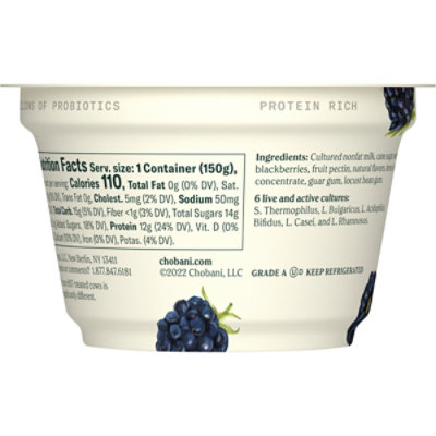 Yogurt by Chobani, Inc. nutrition facts and analysis. This serving contains 2 g of fat, 13 g of protein and 21 g of carbohydrate. The latter is 15 g sugar and 2 g of dietary fiber, the rest is complex carbohydrate. Yogurt by Chobani, Inc. contains 0 g of saturated fat and 4.5 mg of cholesterol per serving. 150 g of Yogurt by Chobani, Inc. contains 0.0 mg vitamin C as well as 0.00 mg of iron, 150.00 mg of calcium, 210 mg of potassium.