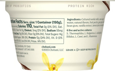Chobani Nutrition Facts. Calories, carbs, fat, sodium & more - MyFoodDiary Chobani Key Lime Blended Greek Yogurt. 1 container (150g) Nutrition Facts. 140 calories. Log food. Chobani Madagascar Vanilla & Cinnamon Greek Yogurt w/ Less Sugar. 1 container (5.3 oz) Nutrition Facts. 120 calories.