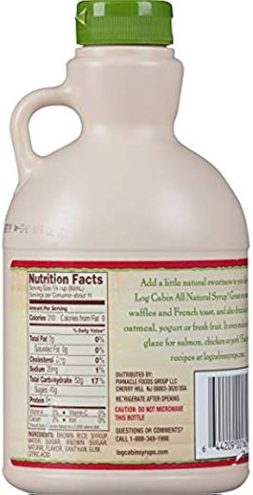 Log cabin maple syrup nutrition facts. Calories in Log Cabin Original Syrup and Nutrition Facts There are 110 calories in 2 tbsp (30 ml) of Log Cabin Original Syrup. Calorie breakdown: 0% fat, 100% carbs, 0% protein. Related Syrup from Log Cabin: Sugar Free Syrup Lite Maple Syrup Sugar Free Maple Syrup Maple Syrup Lite Syrup All Natural Table Syrup find more log cabin syrup products More Products from Log Cabin: LOG CABIN Original Syrup | Conagra Foodservice With no high fructose corn syrup, you can feel good about serving it to your family and guests. Log Cabin: The Best Traditions Start With the Best Ingredients. Measure Packaging Size: 4/128 OZ Gross Weight: 48.1 Net Weight: 45.512 Case Length: 13.875 Case Height: 12.25 Case Width: 11 Volume: 1.082 Ti / Hi: 11 / 4 Total Pallet: Preparation Log Cabin Syrup Nutrition Facts - Eat This Much Jack in the Box. Nutrition Facts. For a Serving Size of 1 serving ( 62 g) How many calories are in Log Cabin Syrup? Amount of calories in Log Cabin Syrup: Calories 190. Calories from Fat 0 ( 0 %) % Daily Value *. How much fat is in Log Cabin Syrup? Log Cabin | Traditional Syrups & Pancake Mix With Log Cabin Sugar Free syrup, you enjoy the delicious flavor of Log Cabin Original, but with 90% fewer calories and 0g of sugar. (12 and 24 fl. oz. bottles) Buy Now All Natural Log Cabin All Natural table syrup has no high-fructose corn syrup, no preservatives, and no artificial colors or flavors. Enjoy its great taste, naturally!